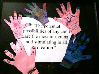 After we got home from having lunch we all did a craft project. This one was really fun to do. I have always liked doing things with the kids' hand prints. I have a wall with our youngests hand prints from the time she was a year old up until she was three. We did her hand prints everytime that she came to visit us for two years. It was kind of neat to see her little hands grow. Anyways, here is the project that we did.So cute and its in a shadow box. The kids colored on their own "hands". Now I just need to find a place on the wall to hang it.